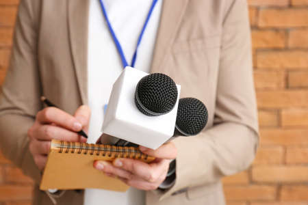 Journalist or news reporter holding microphone and taking notes at press conference or media event