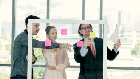 Millennial Asian Indian professional successful male businessman and female businesswomen colleagues in formal business suit standing pointing post it sticky note on glass board discussing together.