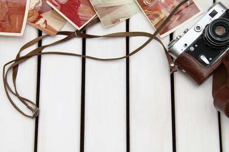 Top view of vintage photographs and 35mm film camera on a rustic wooden table