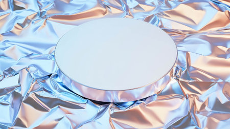 Minimalist white circular podium on metallic crumpled surface for product display and design