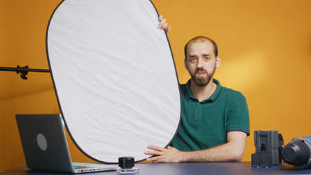 Photographer recording discussing about white light reflector for vlog.