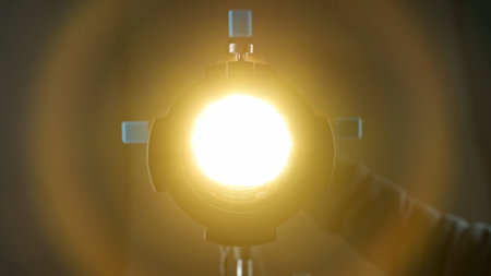 Professional studio for photo and video production filming with modern lighting equipment, close up shot of details, lens flare on bright spotlight.