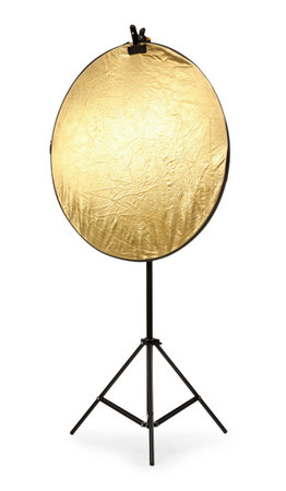 Stand with reflector isolated on white. Photo studio equipment