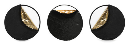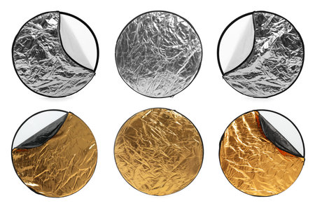 Professional reflectors on white background, set. Photo studio equipment
