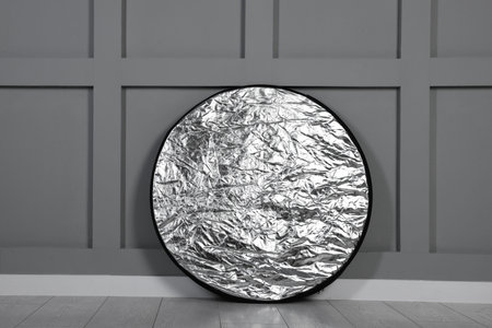 Professional reflector on floor near grey wall. Photo studio equipment