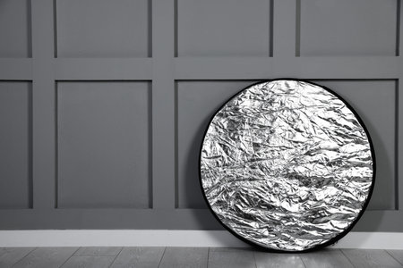 Professional silver reflectors near gray wall in room. photography equipment