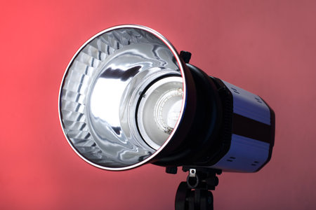 Close up photography studio equipment. Flash bulb and modeling light with beauty dish light modificator.