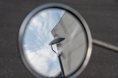 Reflection of a modern lantern in a round side mirror. The sky and the clean lines create an abstract motif.