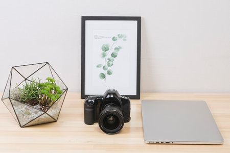 A captivating workspace featuring a camera and tablet amidst lush greenery on a wooden desk. This arrangement inspires creativity and productivity.