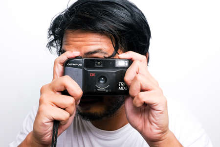Klang,Malaysia- Circa April, 2020: A picture of men taking photo using Olympus Trip MD3. Old camera with film used.