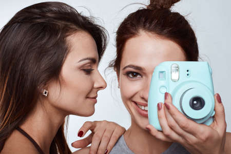 Studio lifestyle portrait of two best friends hipster crazy girls with polaroid wearing stylish bright outfits