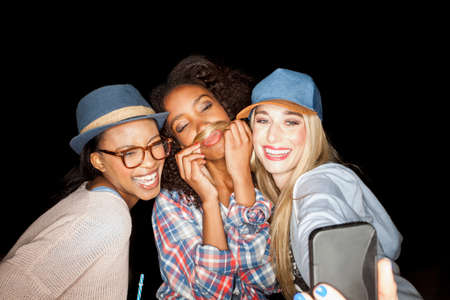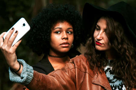 Technology internet and happiness concept. Young women blonde and mixed race taking self picture selfie with smartphone camera
