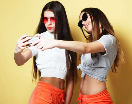 Two pretty girls are making selfie. Modern lifestyle. Studio shot over blue background.