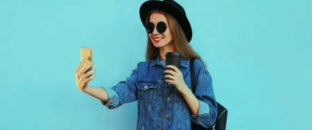 Portrait of stylish woman taking selfie picture by smartphone wearing a black hat, backpack on a blue background