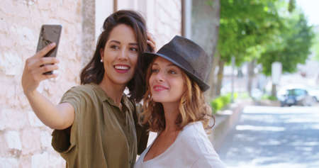two women making a selfie in rural town.Young women smiling happy portrait. Front view, close-up.Women looking at smartphone camera. Friendship or love concept
