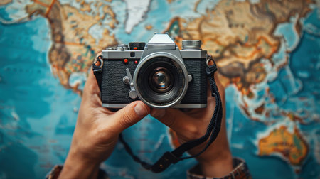 An individuals hand is seen holding a classic black camera over a map, capturing the essence of travel and exploration with a steaming cup of coffee nearby. AI generation