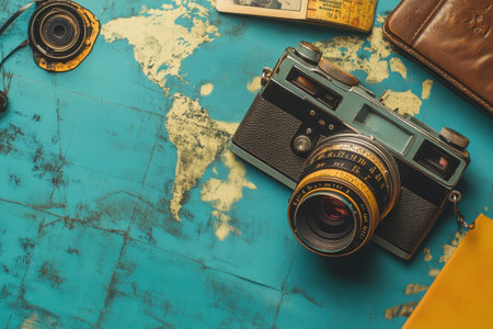 A vibrant travel scene featuring a world map, vintage camera, and stylish accessories, inspiring a sense of wanderlust and the thrill of discovering new destinations