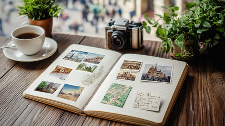 A beautifully arranged vintage travel journal open on a wooden table, featuring photographs, postcards, a classic camera, and a cup of coffee, evoking wanderlust.