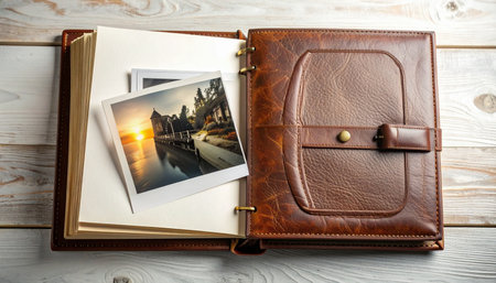 An open leather-bound album rests on a rustic wooden table, revealing a cherished photograph from a past journey.
