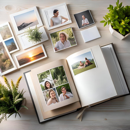 Hands carefully arrange a collection of polaroid-style photos on a wooden table next to an open album. The image evokes nostalgia, memory keeping, and the joy of organizing personal moments.