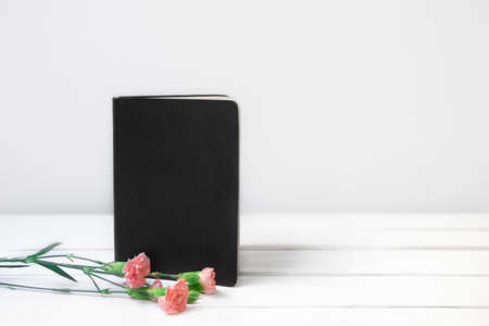 White wooden desk with black empty book or notebook and pink flowers. Front view. Place for text, copy space