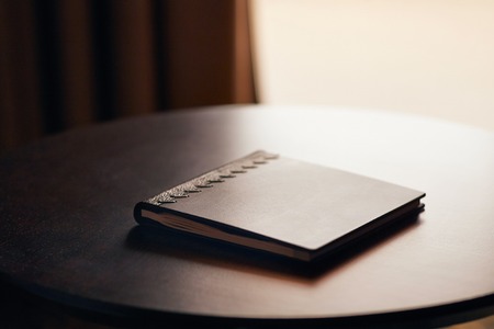 Photo album on a table in a conference room. Selective focus.