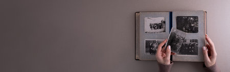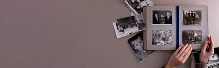 Young woman is looking through family photo album to engage in a memory, selective focus. Happy memories from the old days