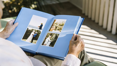 Senior woman browsing photo album, remembering past moments with nostalgia
