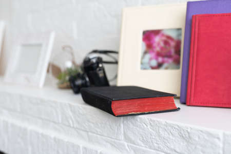 Books and blank photos on wooden table