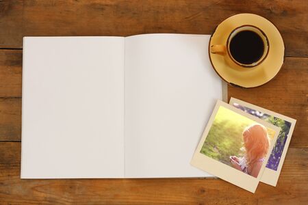 top view of open blank notebook and photographs next to cup of coffee over wooden table