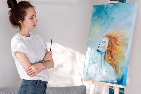 beautiful woman holding paintbrush, happy looking enjoying picture, inspired drawing picture, girls with orange hair. Home workshop. Emotions fantasy, enjoyment creativity inspiration. Art painting