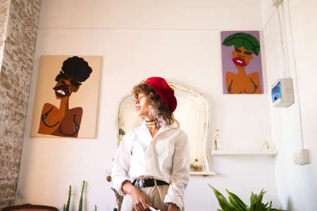 Young, beautiful, bohemian Latina, wearing a red beret on her head and a red vintage suitcase, looking happily at the camera for the photo. Concept of an enterprising woman.