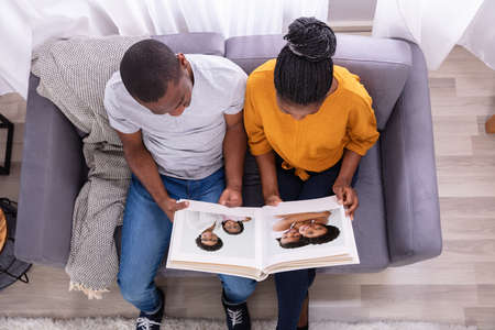 High Angle View Of An African Couple Sitting On Sofa Looking At Photo Album