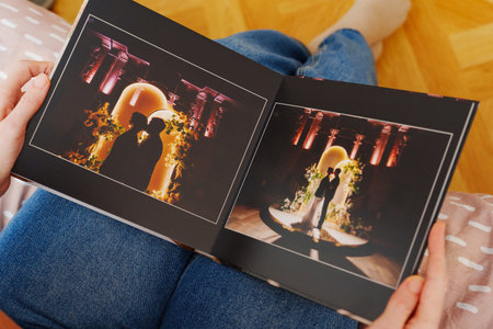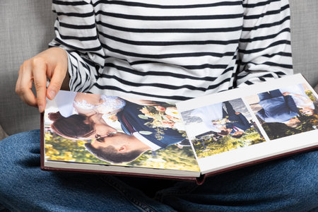 Woman Looking Wedding Photo Book with Wedding Photos, Happy Memories.