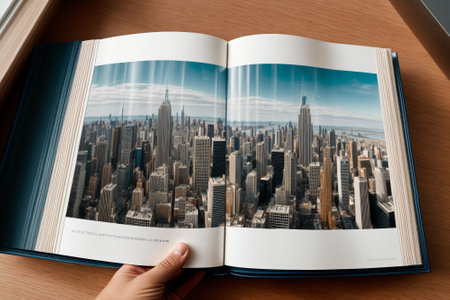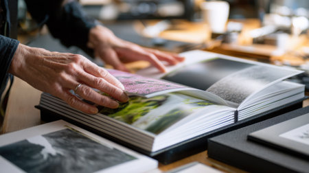 Closeup of hands carefully arranging photos on pages of a hardcover photobook highlighting premium binding and textured cover details in a creative workspace.