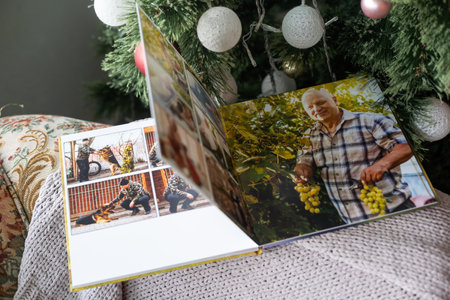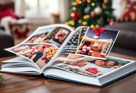 Photo book family photo album under the Christmas tree surrounded by Christmas gifts