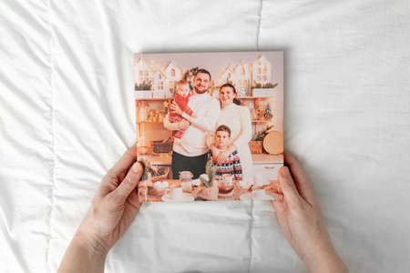 top view woman holds photobook in hands while sitting in bed.family photo shoot