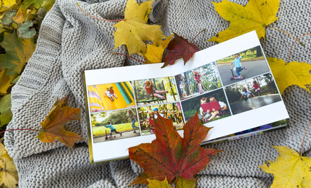Open vintage photo album book with blank paper pages and with copy space for image or for text laying in fallen autumn leaves and retro photos of peoples with no faces on wooden desk table surface background.