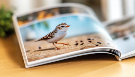 Open magazine displays vibrant photo of small bird walking on sandy beach, showcasing nature photography