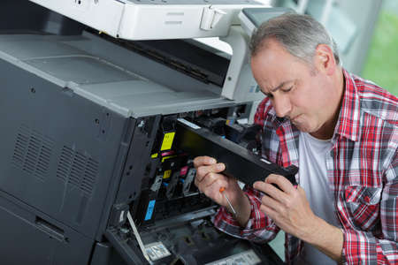 Handyman fixing the office printer at an office
