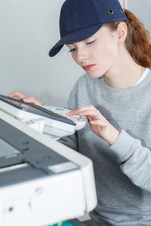 Woman working in printing office, using printer