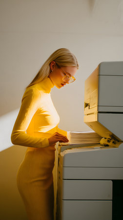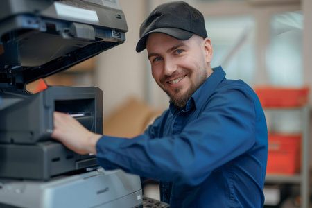 Young employee operates a modern printer in a stylish office environment during the workday