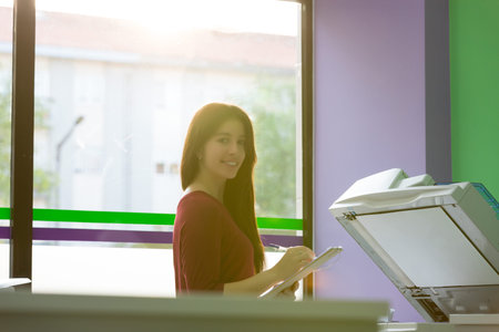 smiling woman makes photocopies in office