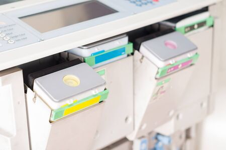 closeup shot digital photocopier machine with color cartridges