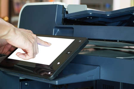 Closeup hand press button to using the photocopier or machine is office work tool printer equipment in copy room for scanning document and print a paper.