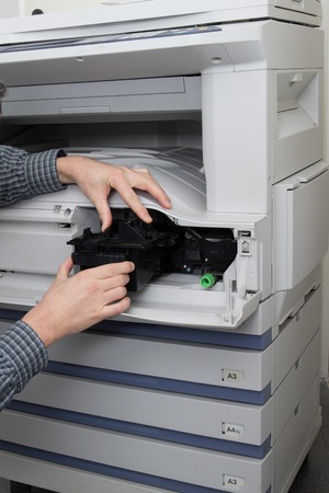 Closeup shot of technician fixing photocopier machine