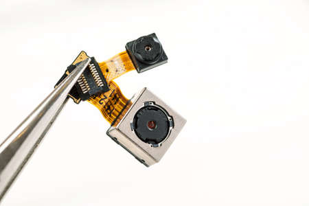 Camera inside, parts of sensor matrix close up. Fixing technology modern device.