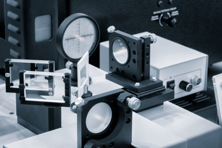 Optical equipment including telescope and lenses are displayed on a table in a laboratory. Optics and photonics concept science experiment with laser background