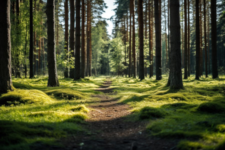 Path in the forest with tall trees and sunlight. Beautiful landscape.
