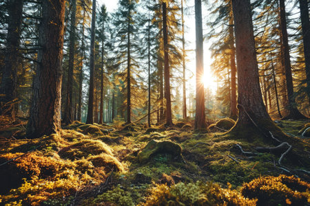 A beautiful forest scene illuminated by soft sunlight at dawn, featuring tall trees and lush underbrush, perfect for nature lovers and outdoor enthusiasts capturing tranquility.
